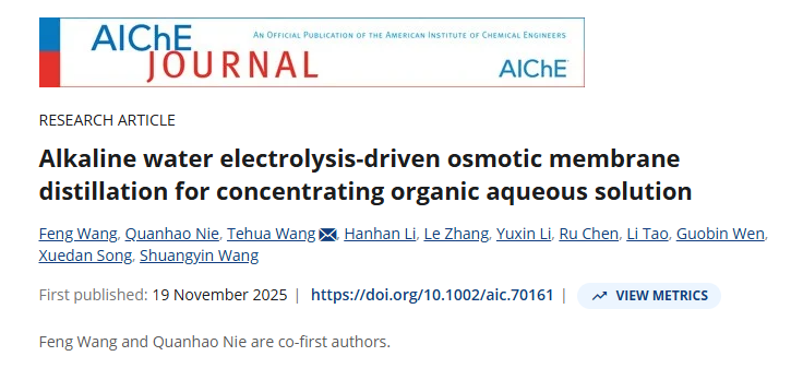 近日,湖南大學(xué)生命交叉研究院在化工領(lǐng)域頂級(jí)期刊 AIChE Journal 上發(fā)表了題為 “Alkaline water electrolysis-driven osmotic membrane distillation for concentrating organic aqueous solution” 的研究論文。